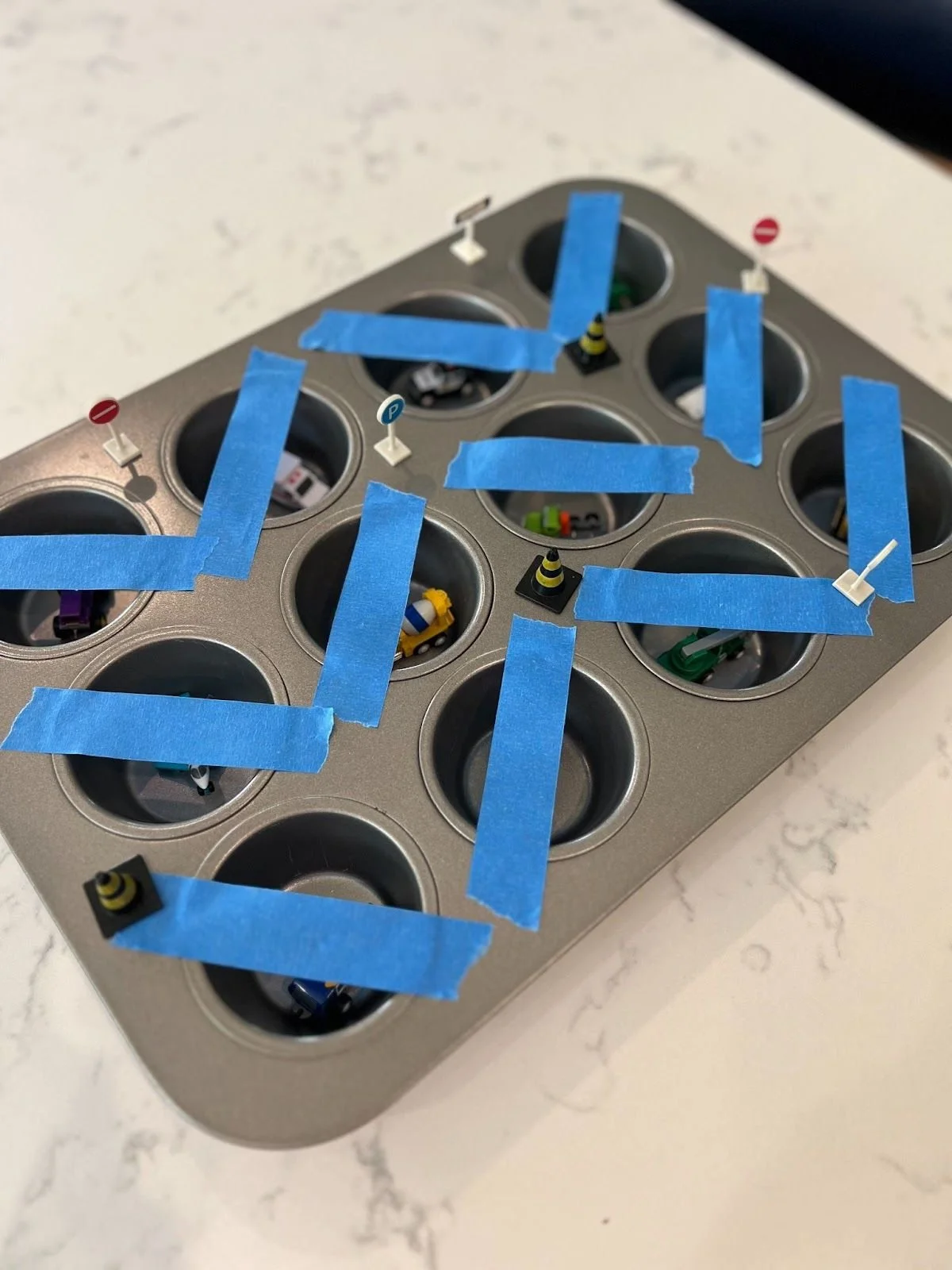 Simply use a muffin tin, some cars and painters tape. Ask your preschooler to cut the tape to rescue the vehicles. The mini cars I used are linked here