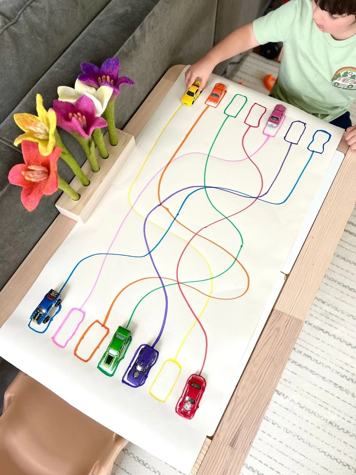 Road tracing is a super fun way for car lovers to trace, match colors and develop pre-writing skills using cars. Trace around the shape of a car with one color on both ends of the paper, connect with a colored line. Repeat with different colors.