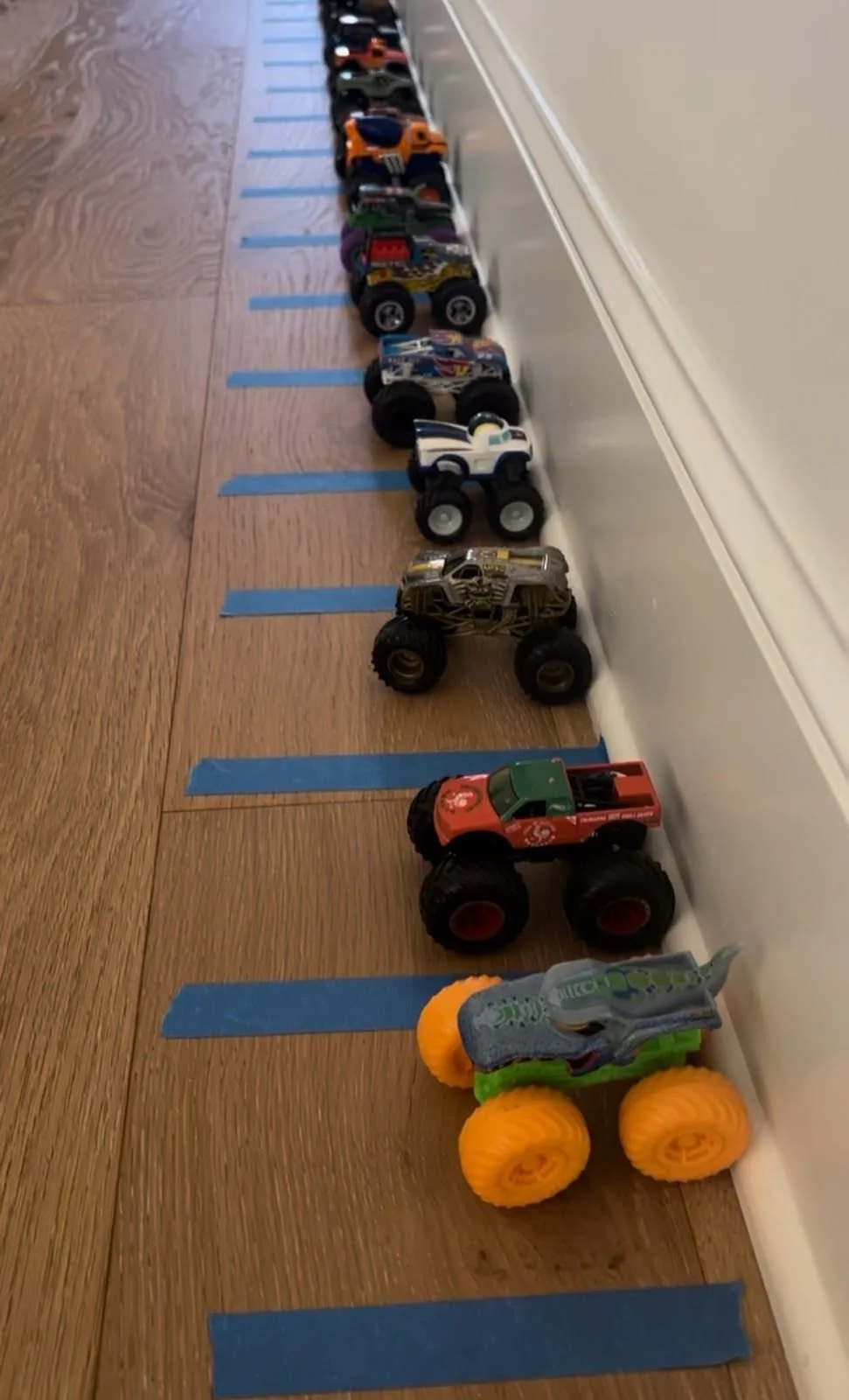 Make a parking lot using painters tape on the floor with your kids favorite monster trucks. It is the easiest activity to set up and my kids always ask to make it! Minimal effort, maximum entertainment.